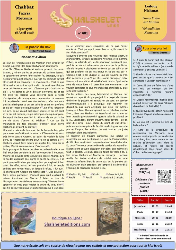 Pour commander nos livres « A la table de Chabbat : Vayikra 1 » ou « De Pessah à Chavouot » : rendez vous sur https://shalsheleteditions.com/
